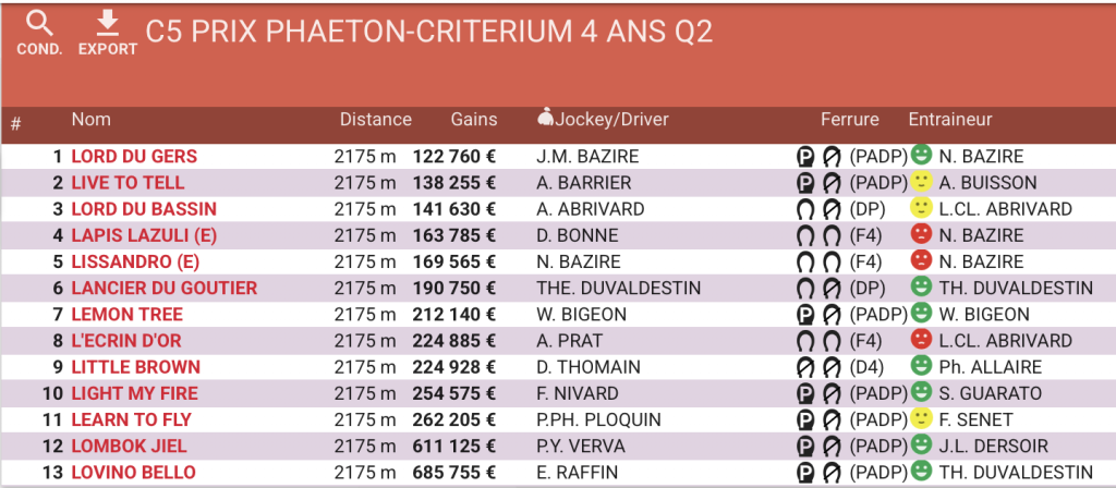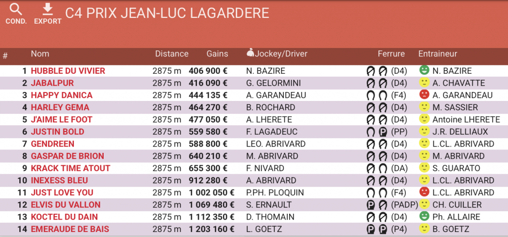 Nos abonnés se sont encore régalés ces derniers jours avec des gagnants à la pelle dont MARDOUK DE GODREL à 8,50 euros, LOVER MAN à 2,90 euros, ICARE DE TROIS à 5 euros, KIKO JOSSELYN lauréat à 5 euros,INDIAN PARK lauréat à 7,30 euros, JUST PRINCESS, KIARA MAURICIENNEà 3,40 euros, MY LOVE ALWAYS à 5 euros, JARDYLAND à 10 euros, KIWI DE CHINE à 7,20 euros, LELICIO BELLO à 2,90 euros, IROISE DE LA NOE,LUTECE JISCE à 3,30 euros etc…
