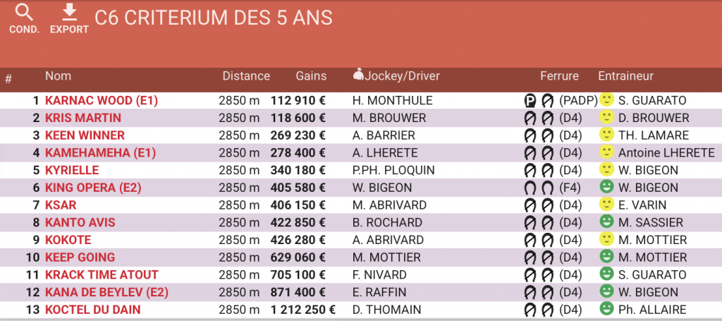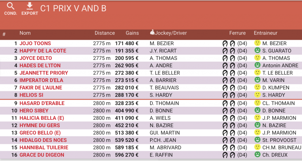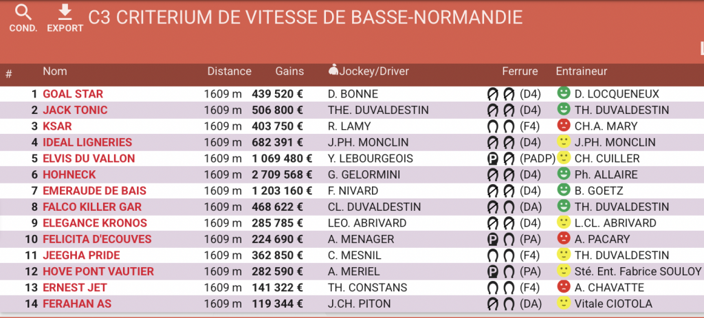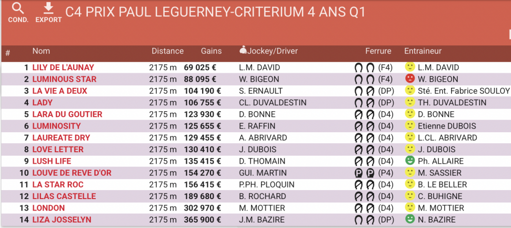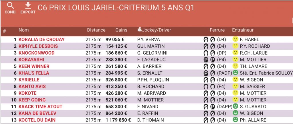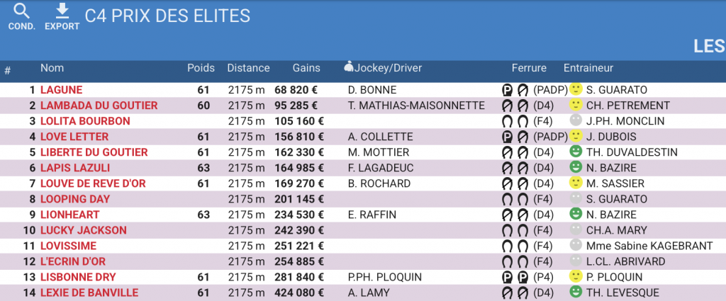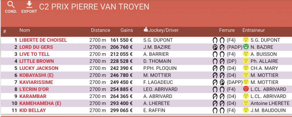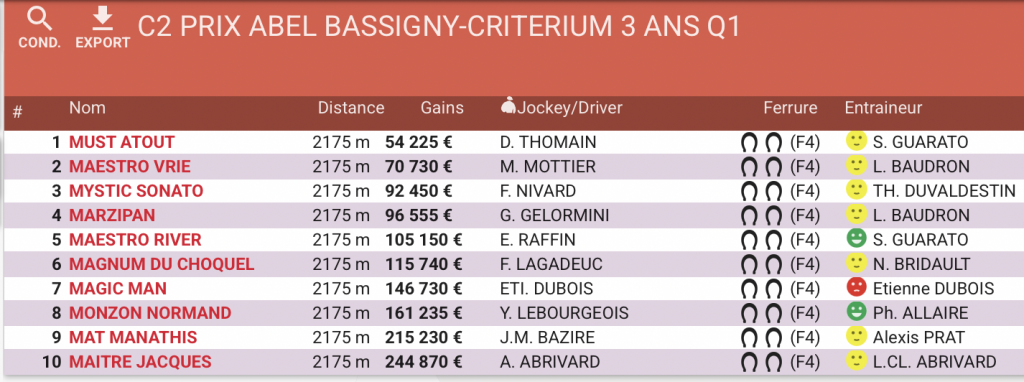 Notons l’excellent comportement de KEENGAME qui ne cesse de progresser depuis quelques mois et la troisième place de JEAN BALTHAZAR toujours présent même s’il n’a plus la même marge qu’auparavant