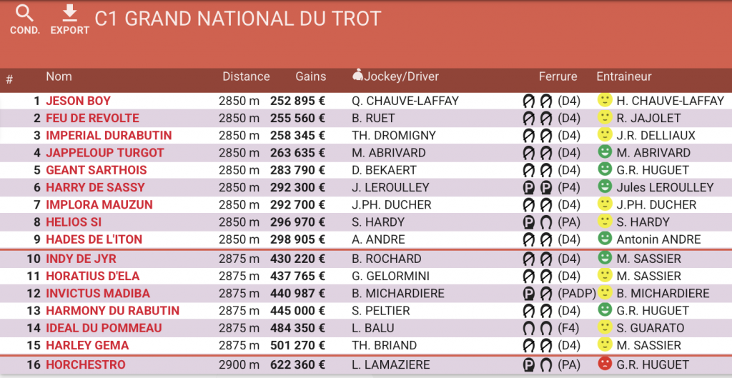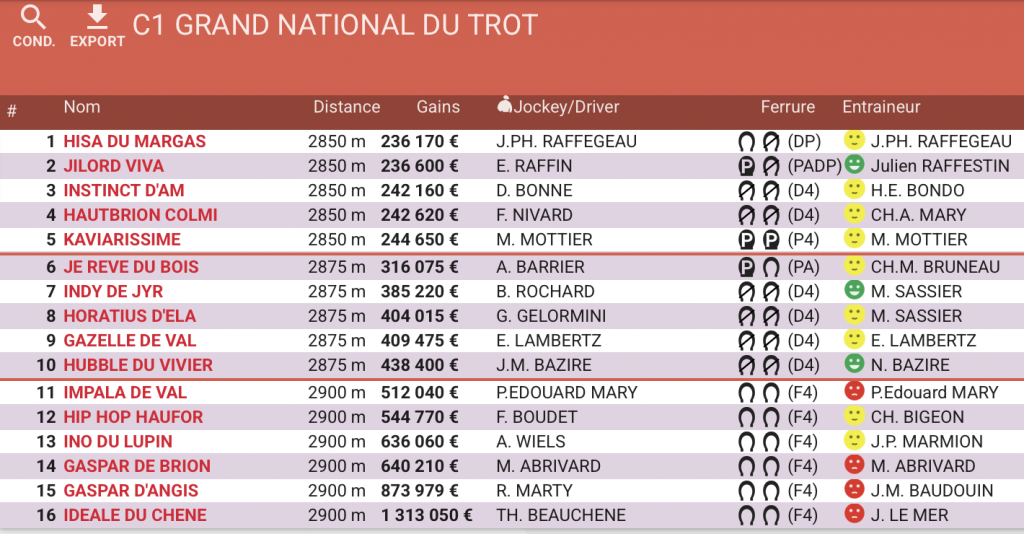 ** Les partants de la 11ème étape du GNT qui se disputera ce Mercredi sur l’hippodrome de Feurs ont été officialisés ce Lundi avec la présence du maillot jaune INDY DE JYR (M Sassier) qui devra se montrer fort pour aller chercher le rouleau compresseur HADES DE L’ITON en tête ou encore IMPLORA MAUZUN car il est très compliqué de rendre la distance sur cette petite piste.