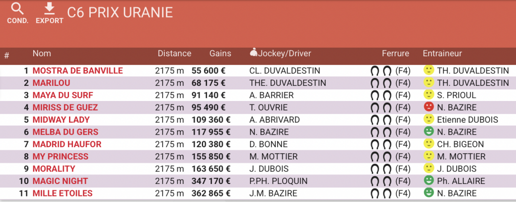 Nous vous avions également annoncés de très belles notes pour ce Samedi en province et ce fût un carton plein avec les victoires de NOTABLE (S Guarato) sur l’hippodrome de Lisieux à 1,90 euros, celle de NONEKA (S Guarato) à Lyon La Soie et le couplé gagnant de nos repérés des qualifications MARCEL (S Ernault) et MEDOC DES GLENAN (F Leblanc) sur l’hippodrome de Saint-Malo.
